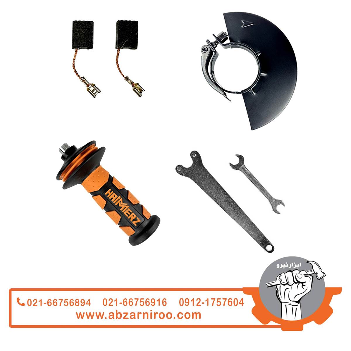 | اقلام همراه | دستگیره کمکی آنتی شوک - محافظ صفحه 180 میلیمتری - آچار صفحه فرز - آچار محافظ صفحه فرز - یک جفت ذغال |